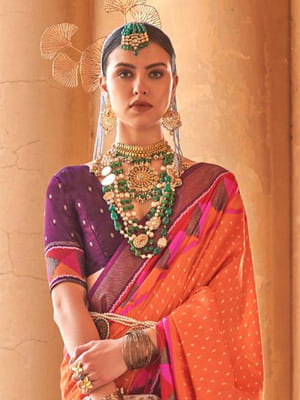 - Patola Sarees: These sarees are handwoven in Patan, Gujarat, and are known for their double ikat weaving technique. Patola sarees feature vibrant colors, geometric designs, and intricate patterns created by dyeing the yarn before weaving.