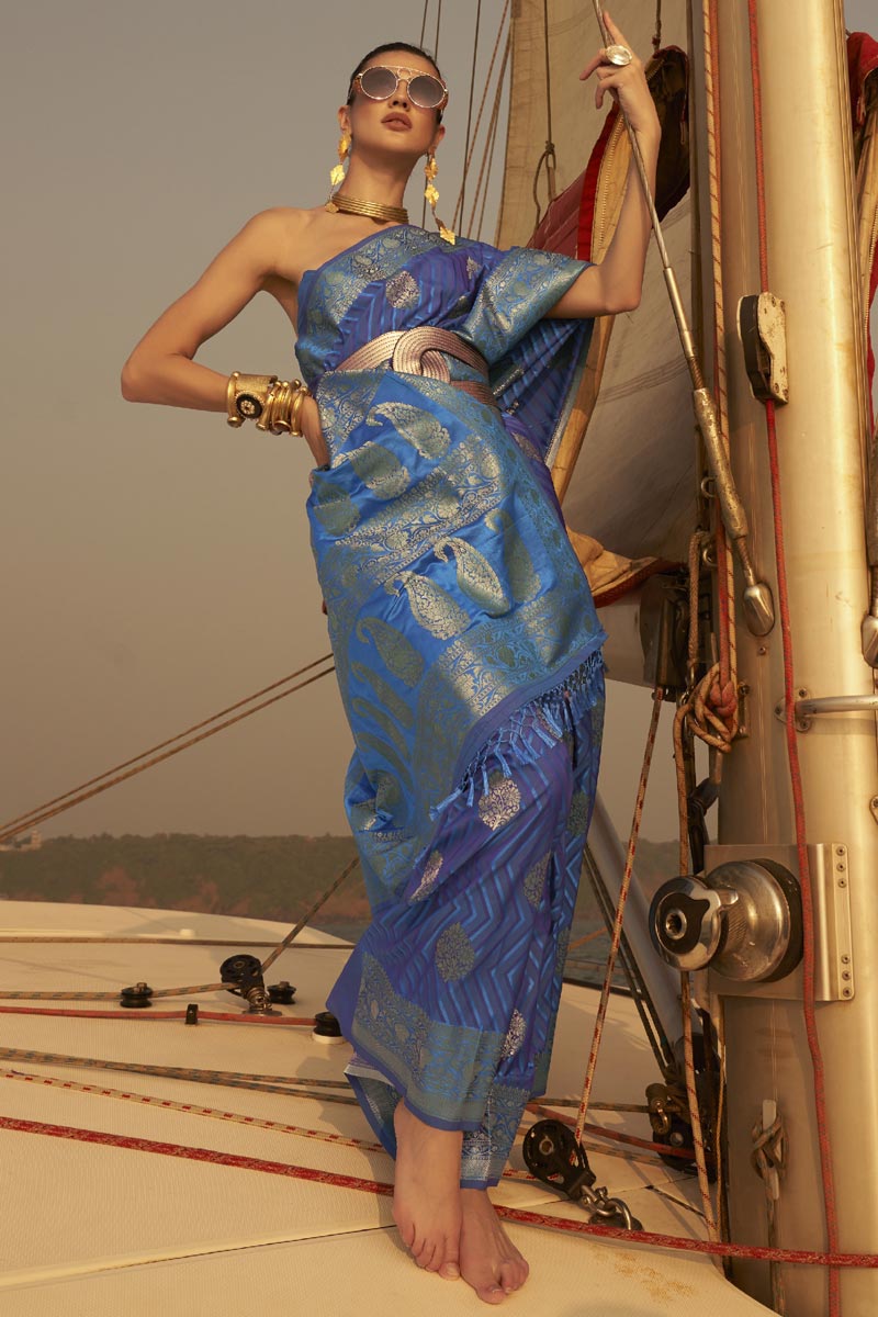 Function Wear Pretty Weaving Work Blue Saree In Satin Fabric