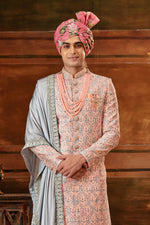 Excellent Peach Art Silk Fabric Hand Work Shrewani