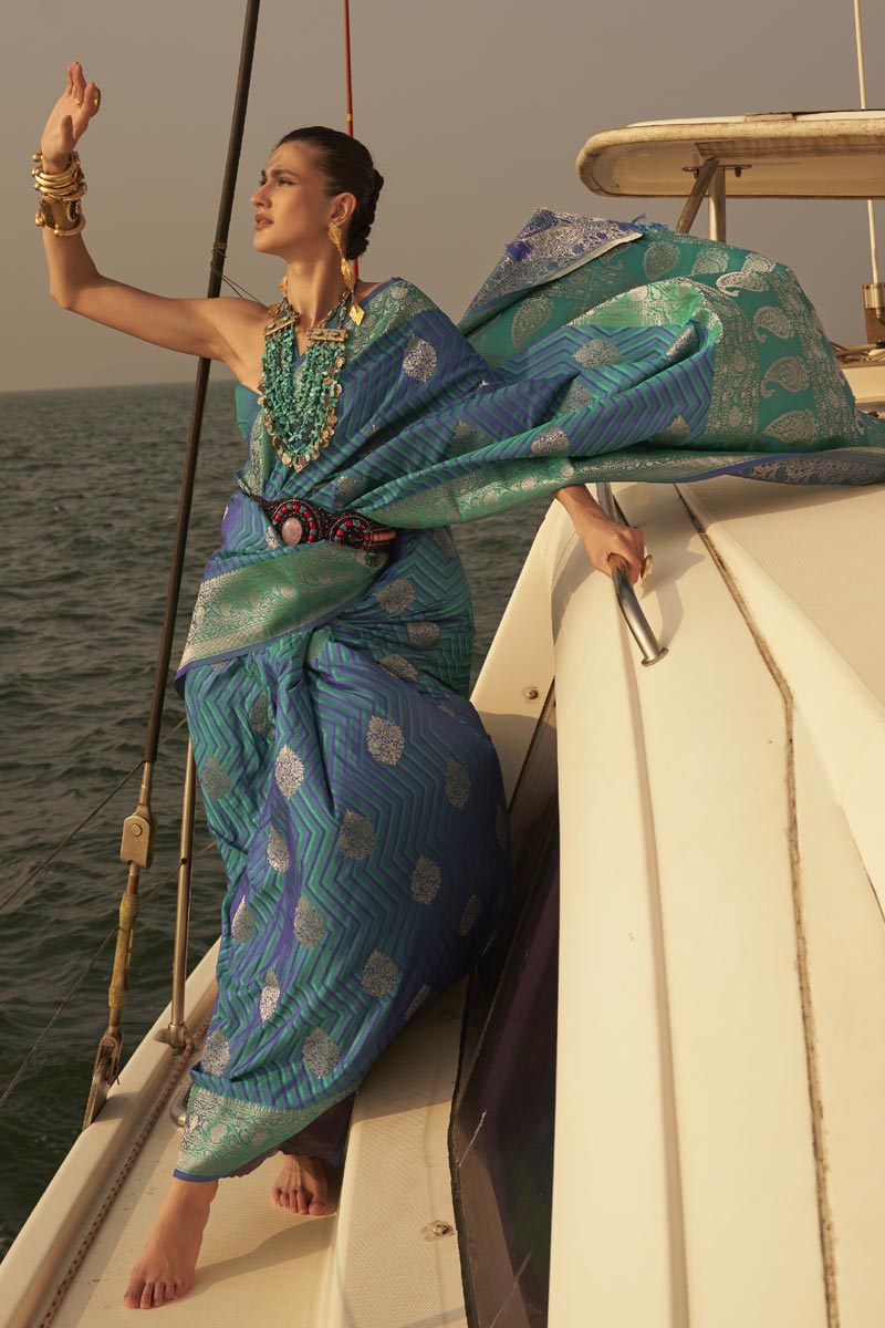 Satin Fabric Majestic Weaving Work Saree In Cyan Color