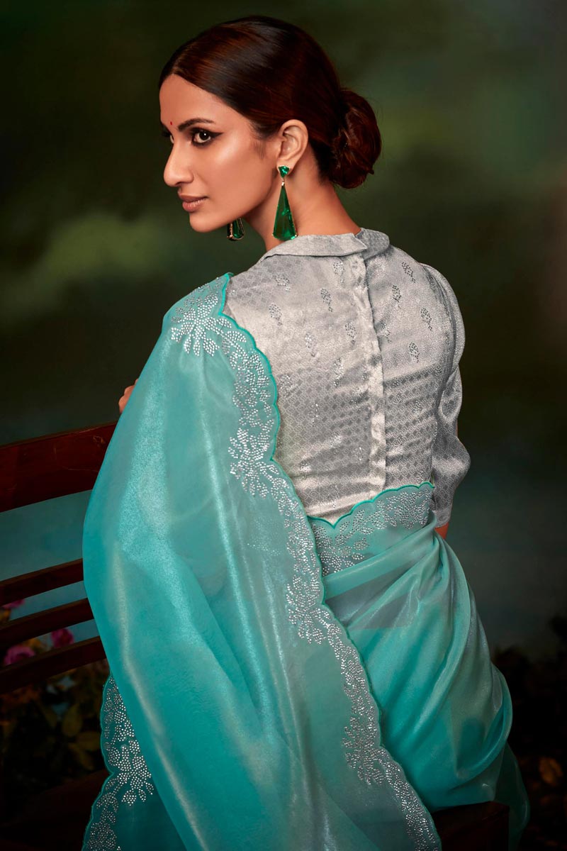 Cyan Color Art Silk Fabric Adorming Fancy Work Saree